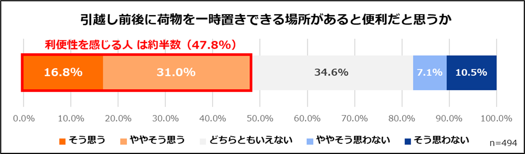 全体としては、明確に否定する層は2割未満にとどまり、一定数が利便性を感じていることが分かる結果となりました。引越し時の荷物置き場ニーズは、潜在的な需要を含めて今後も一定程度存在すると考えられます。