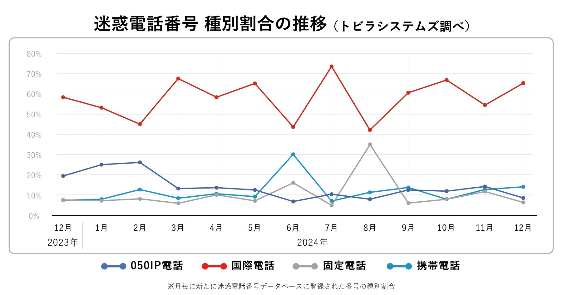 2024年12月に新たにトビラシステムズの迷惑電話番号データベースに登録された番号の種別割合は、国際電話番号が前月から増加し65.4%(前月比+10.9%)でした。2024年は1年間を通して国際電話番号の割合が最も多い状況が続きました。