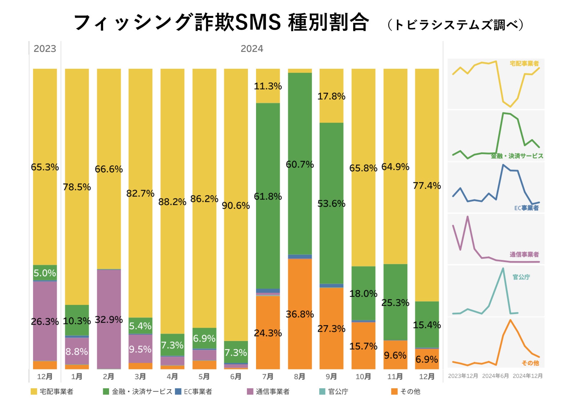 トビラシステムズの調査で、2024年12月に確認されたフィッシング詐欺のSMSの種別割合は、宅配事業者をかたる手口が前月より増加し77.4%となりました。金融・決済サービスをかたる手口は15.4%、その他の事業者をかたる手口は6.9%となりました。