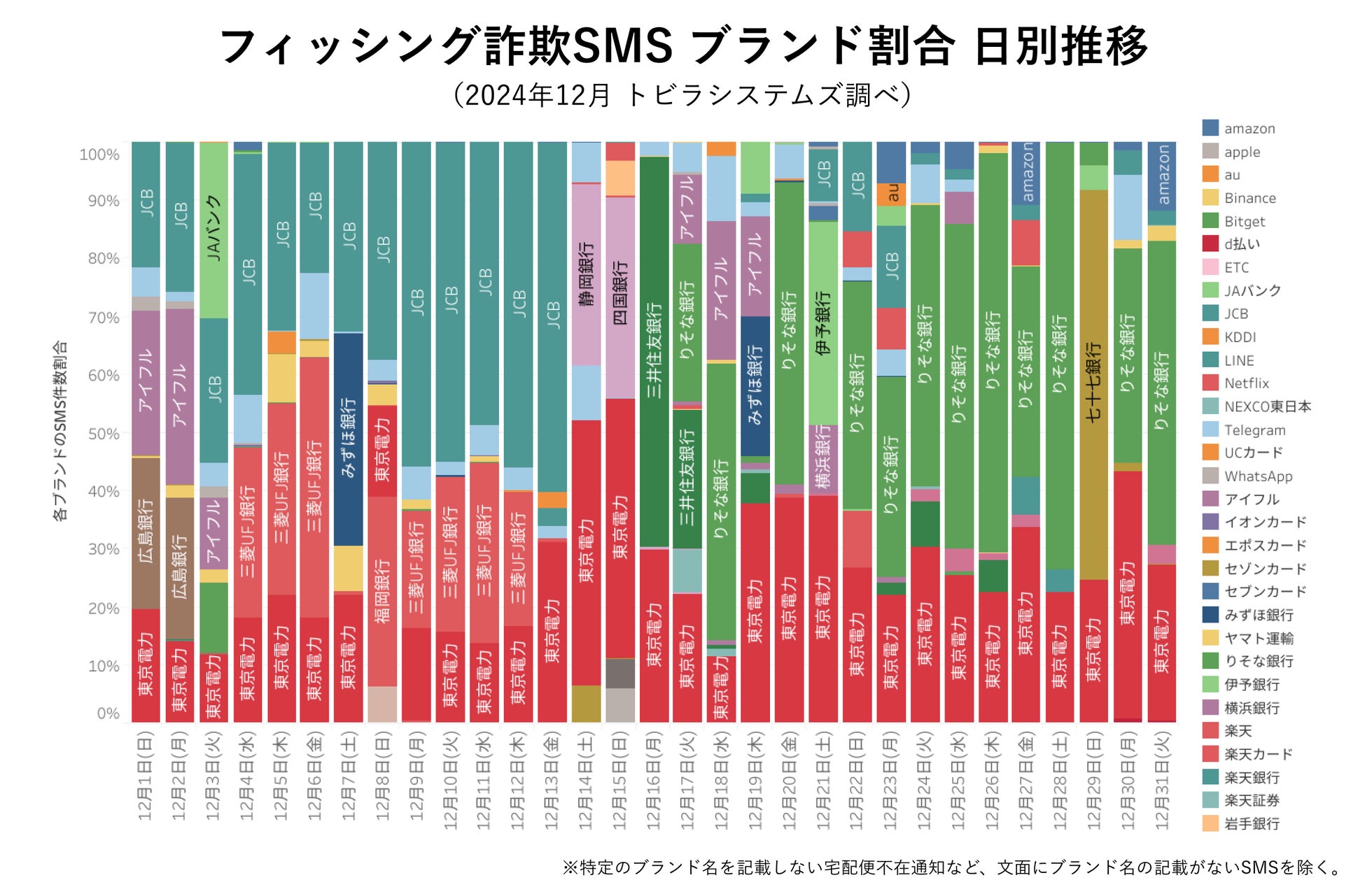 2024年12月は大手銀行や地方銀行、カード会社など、金融機関のブランド名を悪用したSMSが1か月を通して多発しました。「三菱UFJ銀行」「JCB」「りそな銀行」をかたるSMSが目立ったほか、複数の地方銀行ブランドをかたるSMSが局所的に発生しました。