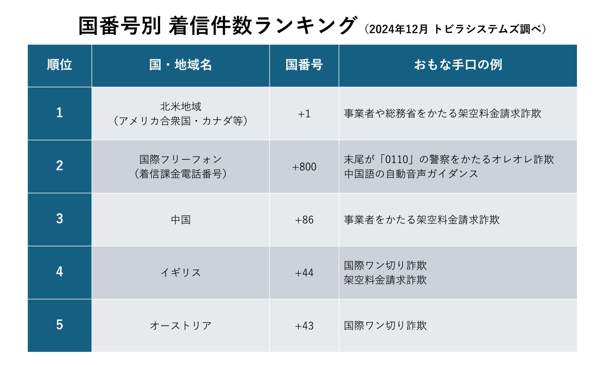 当社の調査で、2024年12月に着信件数が多かった国際電話の国番号は、上位からアメリカ合衆国やカナダなどの北米地域、国際フリーフォン(注1)、中国、イギリス、オーストリアでした。