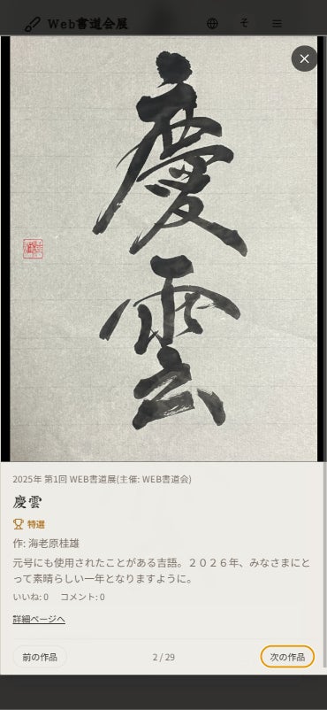 現在1,700名を超えるWeb書道会アプリと、Web書道会展サービスで募集を行い33作品がWeb上に展示され、審査を経て、記念すべき初代グランプリが決定いたしました。