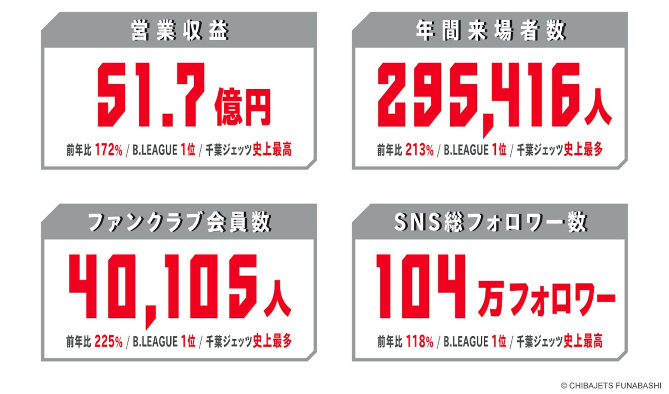 株式会社千葉ジェッツふなばし(代表取締役社長:田村征也 本社:千葉県船橋市)は、良い時も悪い時も私たちを支え続けてくださった皆さまのおかげで、2024-25シーズンにおいて過去最高の事業実績を達成しました。 新ホームアリーナ「LaLa arena TOKYO-BAY」での運営を通じ、来場者数・ファンクラブ会員数・SNSフォロワー数など主要指標が大きく成長し、B.LEAGUEの中でも高い支持を得るシーズンとなりました。 一方で、競技面では惜しくもタイトル獲得には至らなかったものの、チームの挑戦と進化を通じて多くのブースターが熱狂し、クラブ全体の基盤強化につながった1年となりました。