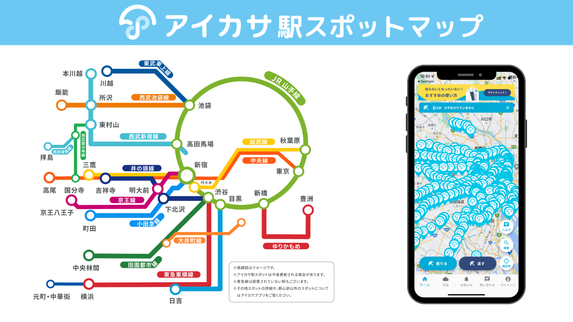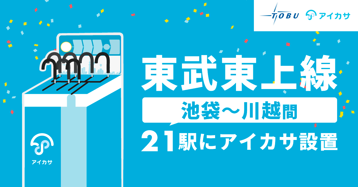 「アイカサ」は、2018年12月にサービスを開始した日本初の本格的な傘のシェアリングサービスです。突発的な雨にもビニール傘をその都度購入せずに、傘スポットから気軽に借りられ、雨が止んだら最寄りの傘スポットに返却することができます。東上線は、池袋からJR山手線に接続、和光市からは東急東横線やみなとみらい線までの直通運転を行っており、既にアイカサの導入が進んでいるエリアへのアクセスの良さがあり、東上線21駅に設置が完了することで、鉄道ネットワークを活かしアイカサをより便利にご活用いただけます。