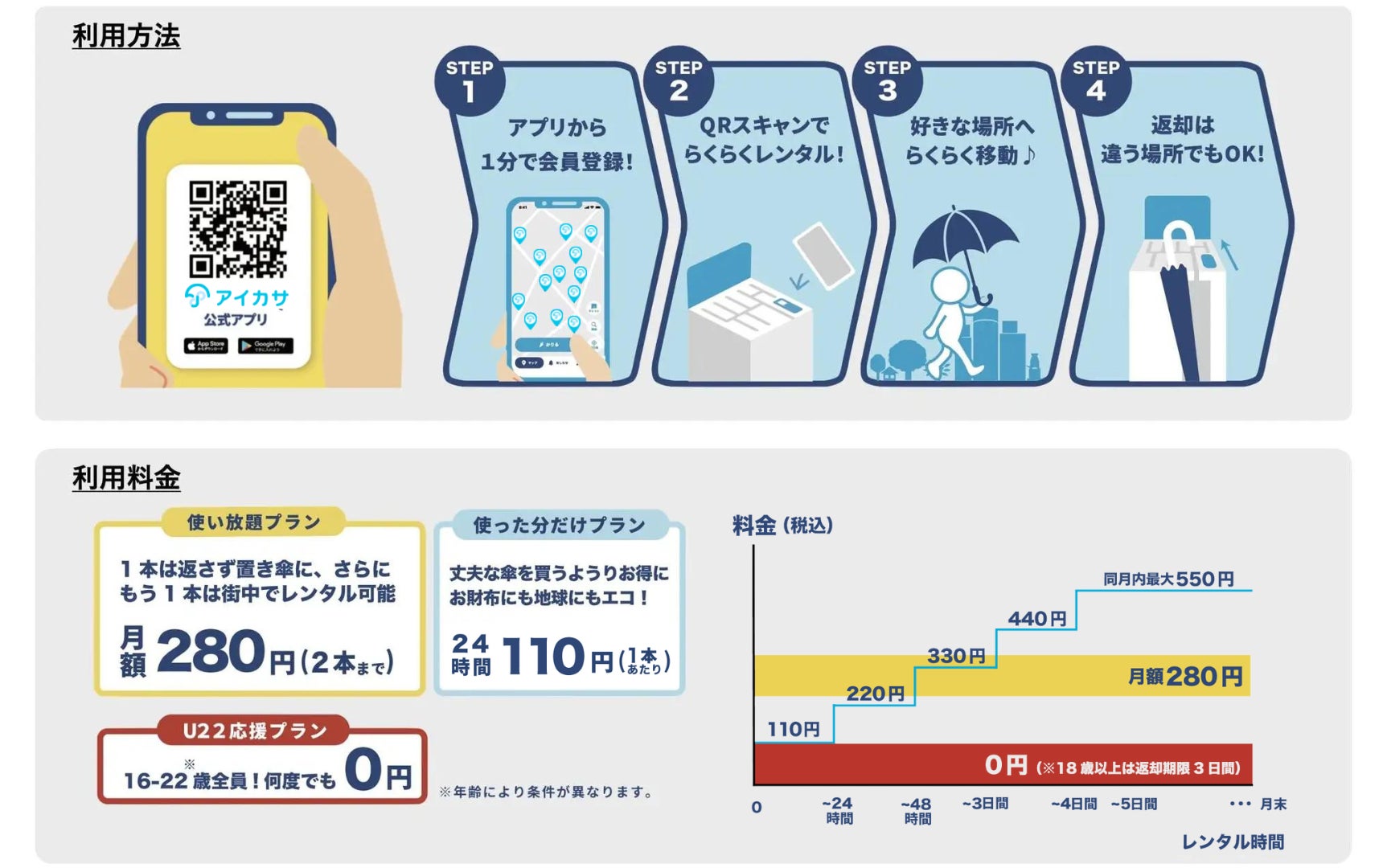 突発的な雨にもビニール傘をその都度購入せずに、駅や街中で丈夫なアイカサを借り、雨が止んだ際には最寄りの傘スポットに傘を返却することで手ぶらで便利に移動ができるのが特徴です。