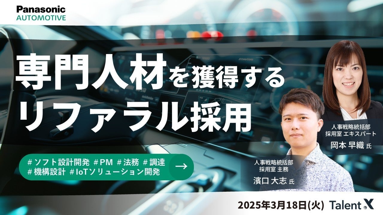 株式会社TalentX(本社:東京都新宿区、代表取締役:鈴木貴史)は、パナソニック オートモーティブシステムズ株式会社(代表取締役社長:永易 正吏、本社:神奈川県横浜市、以下:「パナソニック オートモーティブシステムズ」)をゲストにお招きして、「専門人材を獲得するパナソニック オートモーティブシステムズのリファラル採用」をテーマにお話しいただく採用マーケティングセミナーを3月18日(火)に開催いたします。