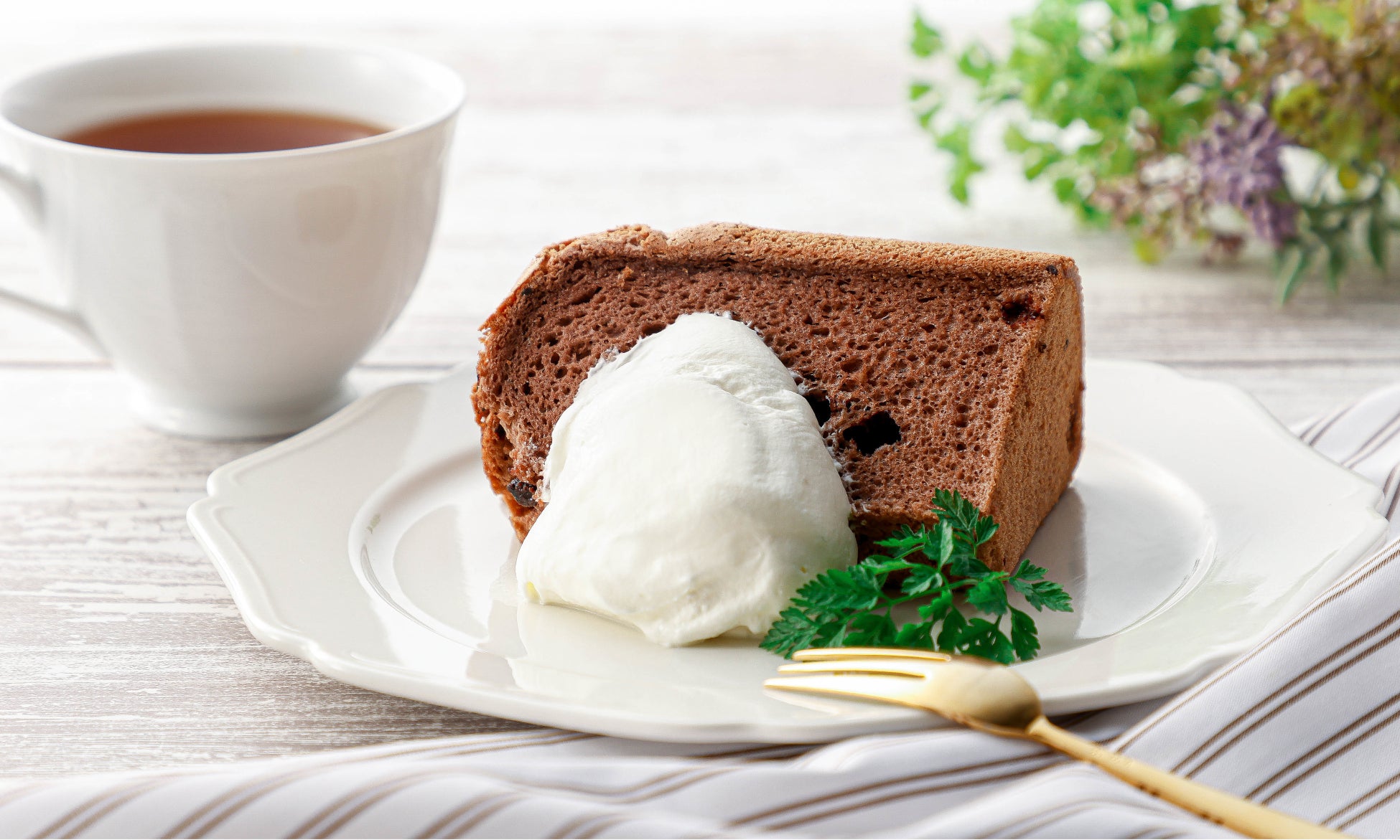 今回、その特徴はそのままに、ココア生地にチョコチップを入れたチョコづくしのシフォンケーキに仕上げました。シフォンケーキの素材の味を活かしつつ、「優しいココアの甘さ」が香るよう、ココアの配合にこだわりました。また、お子さまも女性も大好きなチョコチップを入れることで、味にアクセントをプラスしました。