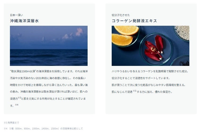 deep2031の特徴である「日本一深い(※4)沖縄の海洋深層水」と「コラーゲン発酵液エキス(※5)」についてのこだわりをお伝えしています。