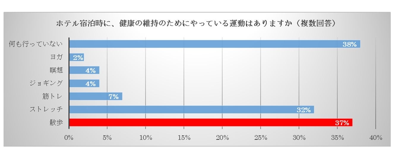 調査の結果、普段から健康に気を付けている方が60%以上であり、もっとも多い1日あたりの歩数は4,000歩以上6,000歩未満でした。また、ホテル宿泊時に最も行っている運動は「散歩」でした。