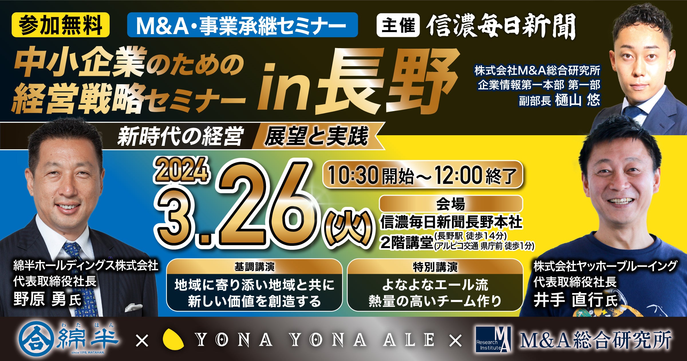 この度、長野県の中小企業の事業承継や成長戦略をテーマに、セミナーを実施させていただく運びとなりました。