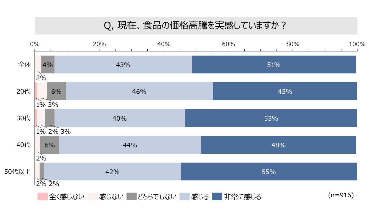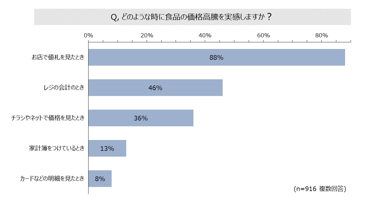 食品の価格高騰を実感している方は94%、お店で値札を見たときに特に実感しています。値上げに対して困っている方は92%、全体的に値上げをされたら困る食品として特に野菜、精肉・肉加工品が挙げられています。いつも購入している食品が値上げしたら躊躇する方は83%、値上げによって買い控える商品が増え、より安い商品に切り替えたとする方が多くいました。