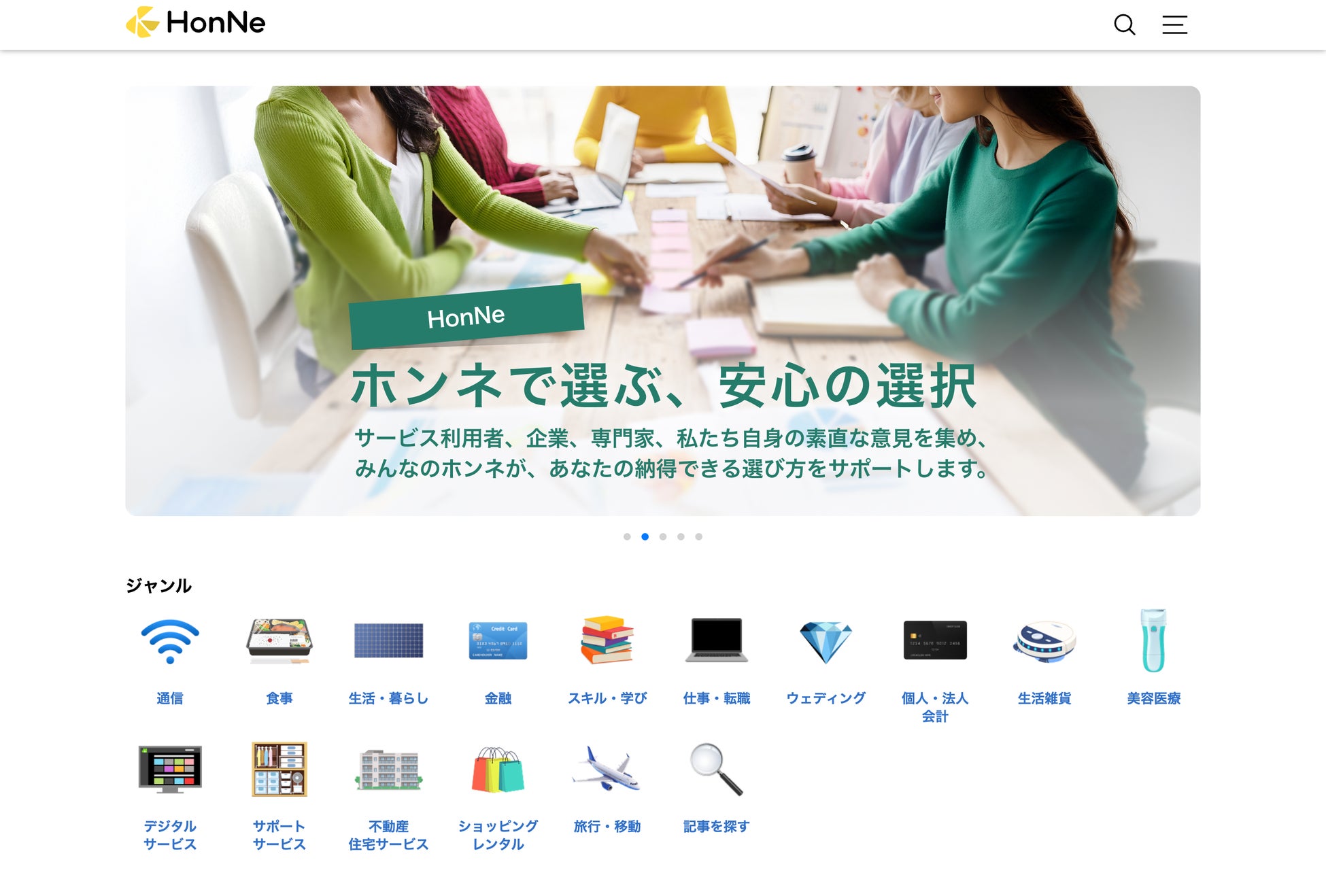 総合比較メディア「HonNe」は、生活と仕事の分野でおすすめの商品サービスを紹介するWebサイトです。
