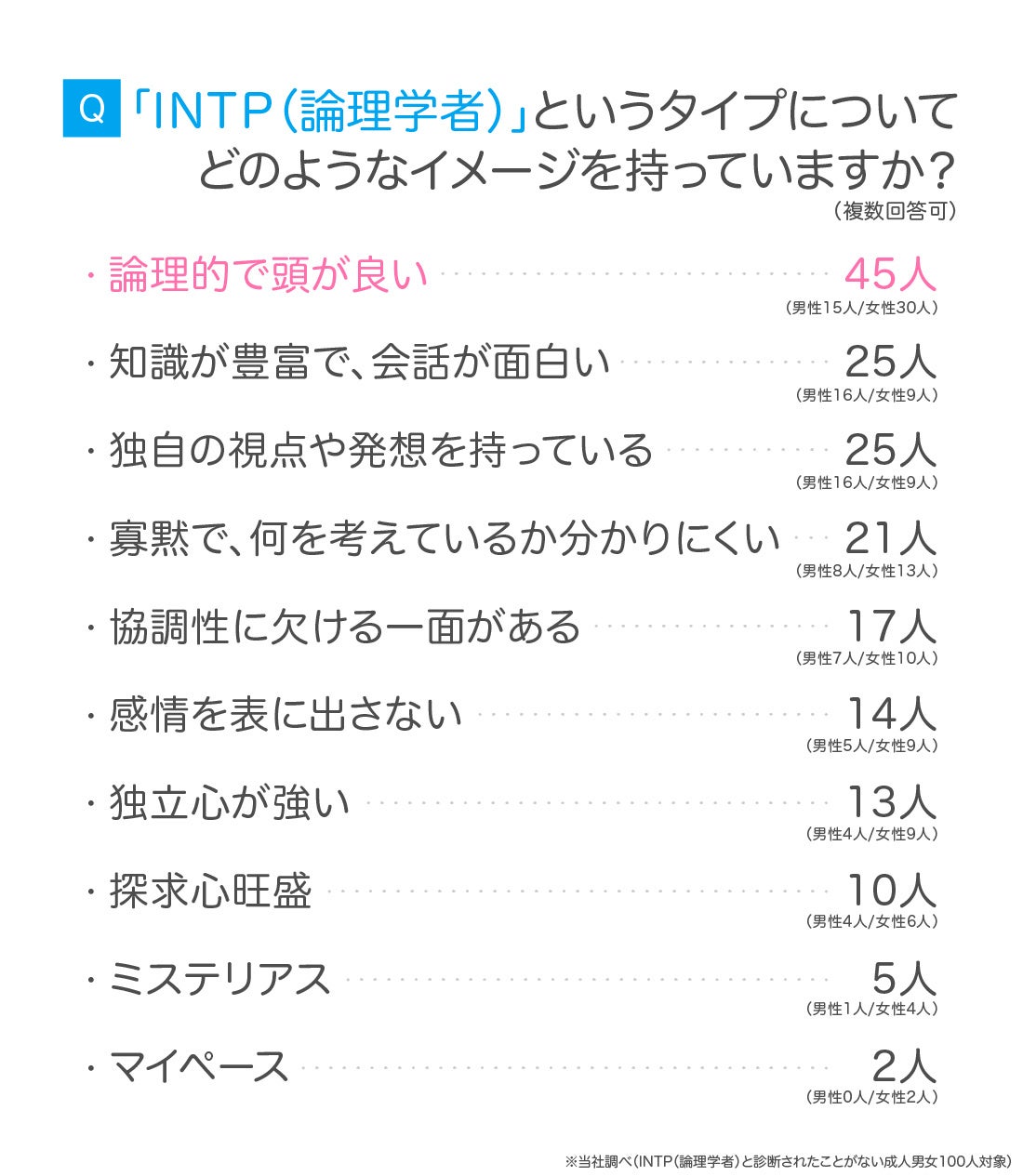 今回のアンケート調査から、INTP(論理学者)タイプの人は「論理的で頭が良い」「知識が豊富」「独自の視点を持つ」といったイメージを周囲から持たれていることが分かりました。