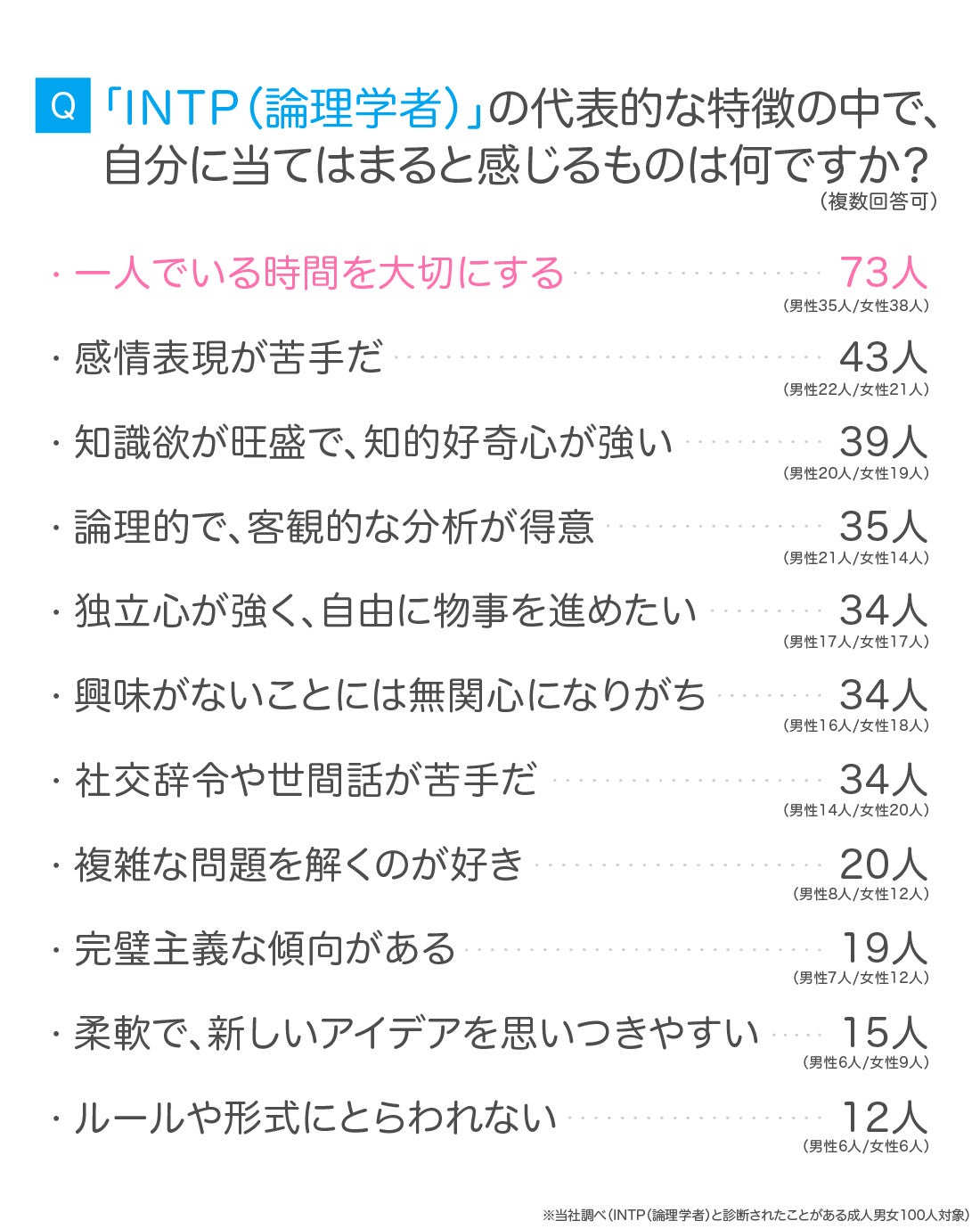 より詳しくINTP(論理学者)について調査するために、先程のアンケートとは別に、「INTP(論理学者)と診断されたことがある成人男女100人」を対象にアンケート調査を実施しました。