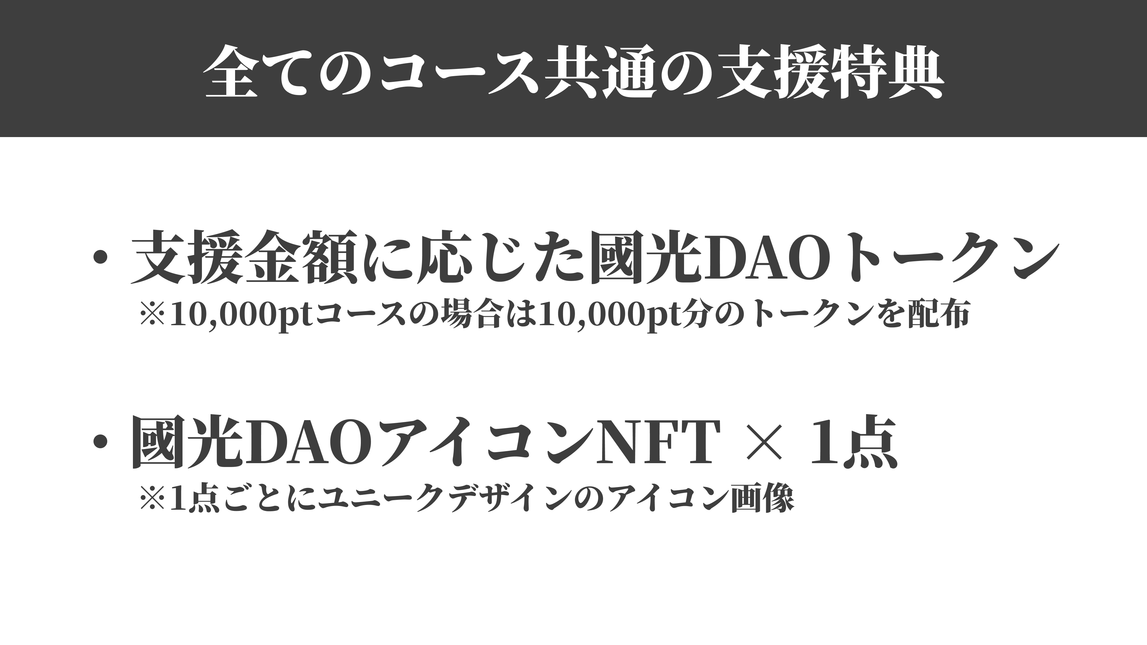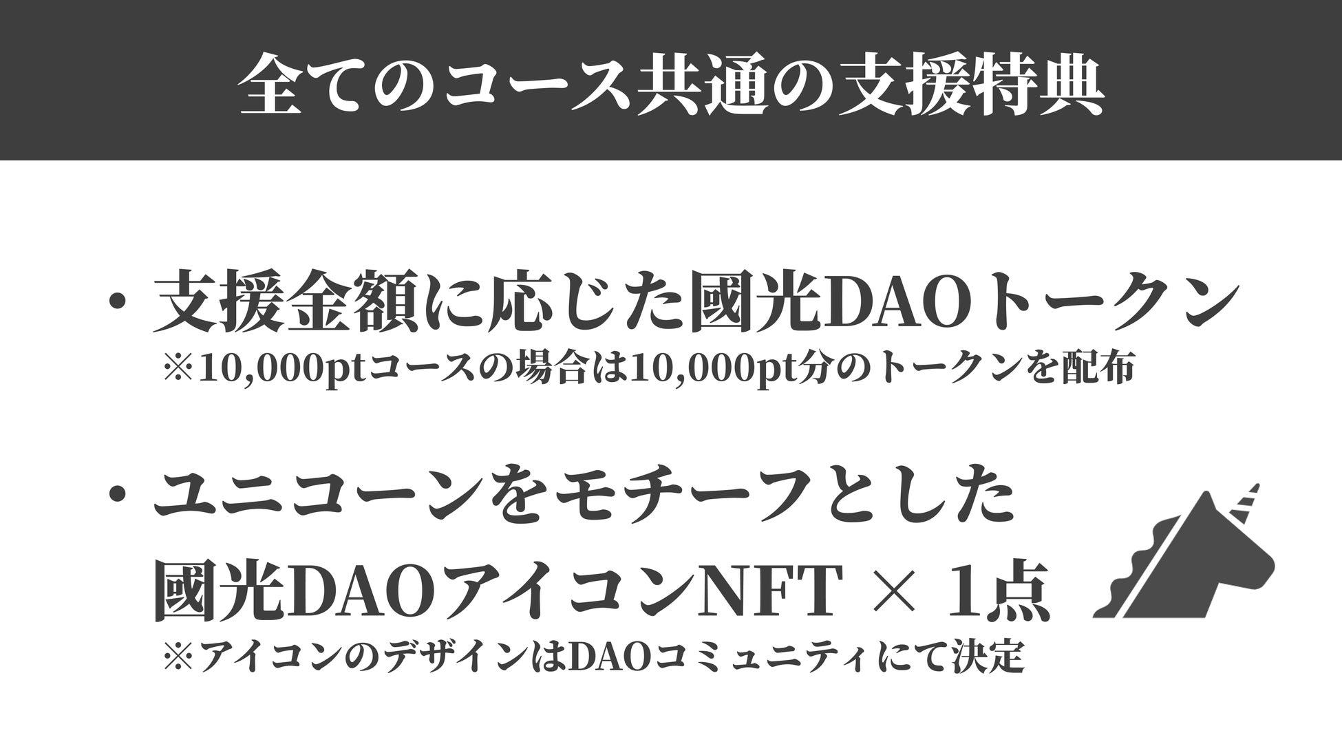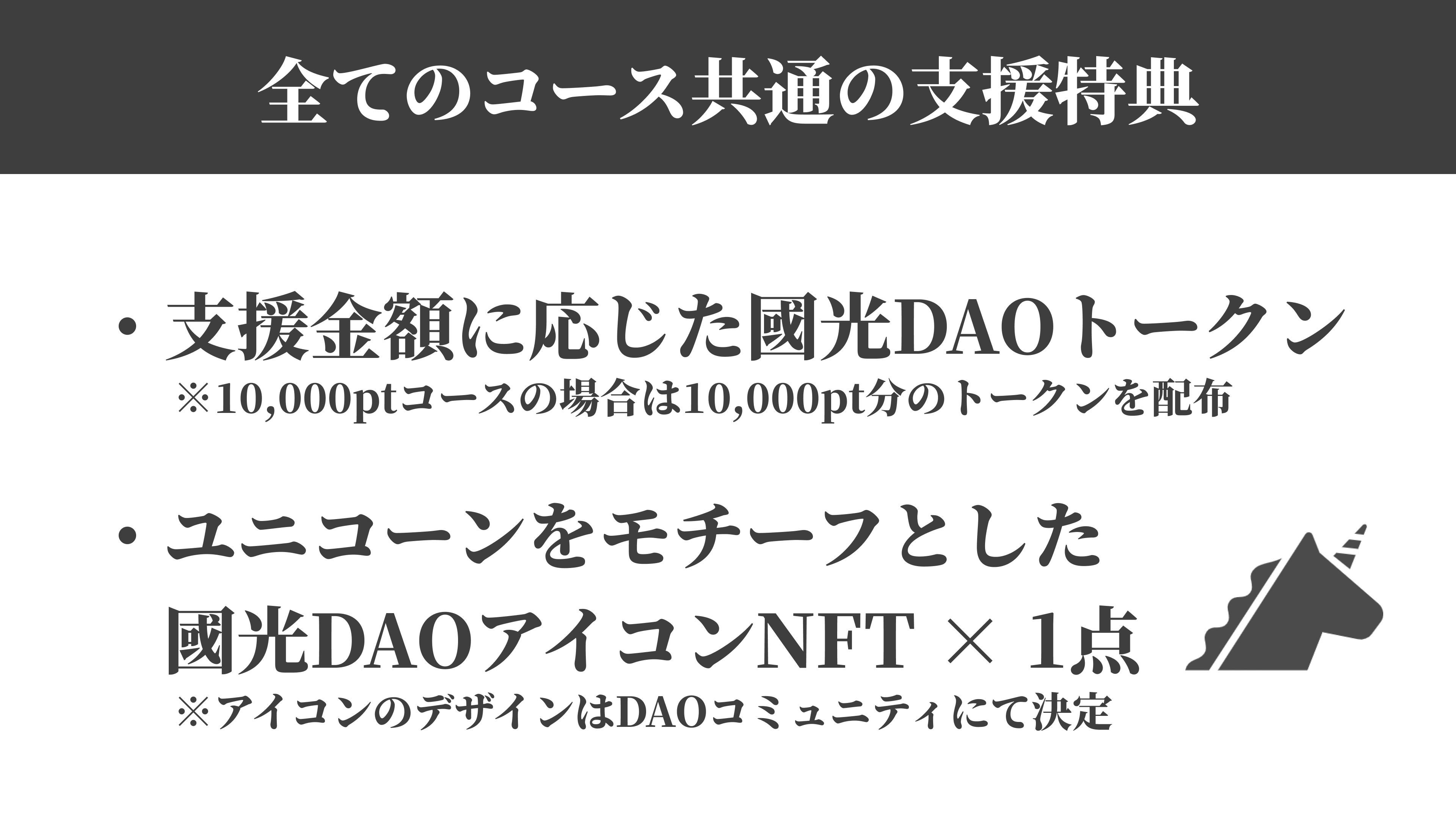 支援コースは複数ご用意していますが、全てのコースで支援金額に応じたDAOトークンの配布とユニコーンをモチーフとした國光DAOアイコンNFTを獲得できます。ご支援いただいた方は、FiNANCiEやSNSのアイコンとして使ってもらえると嬉しいです。