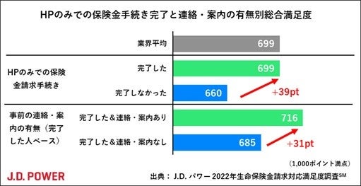 一方で、ホームページを主な請求チャネルとした顧客のうち「全ての手続きがホームページのみで完了した」顧客の割合は年々上昇し、2021年から+6ポイント増加し、66%となった。ホームページのみで「全ての手続きが完了した」顧客の総合満足度は699ポイントと、「全ての手続きが完了しなかった」顧客の総合満足度660ポイントに比べ、+39ポイント高い。加えて、事前に営業担当者や保険会社、代理店から連絡・案内があった場合には満足度は更に高くなり、なかった場合より+31ポイント高くなっている。事前の連絡・案内がホームページでのスムーズな手続き完了や満足度向上に貢献していると考えられる。