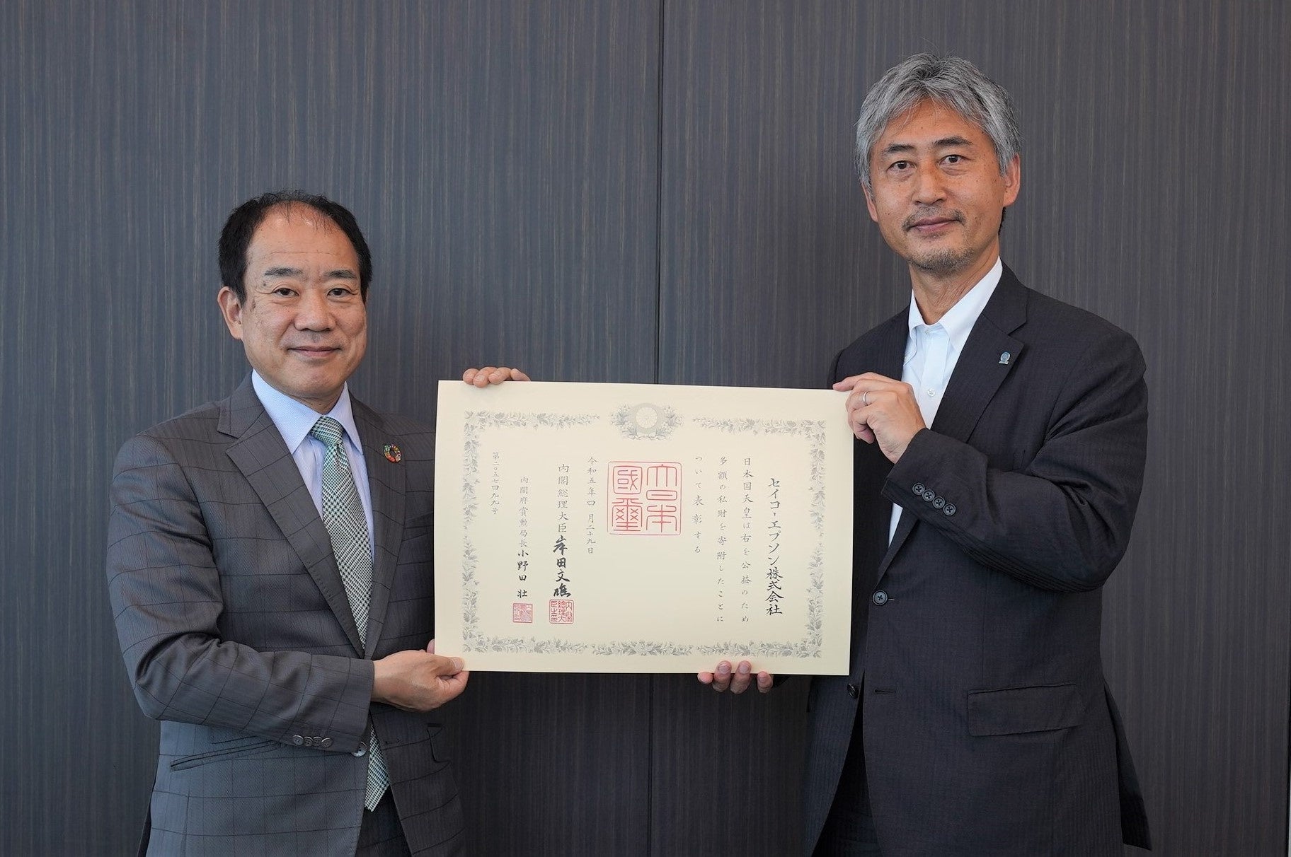 紺綬褒章は、公益のために私財を寄付した個人や法人などに授与されるものです。エプソンは日本政府から、日本の公式支援窓口である国連UNHCR協会を通じて、褒状を授与されました。