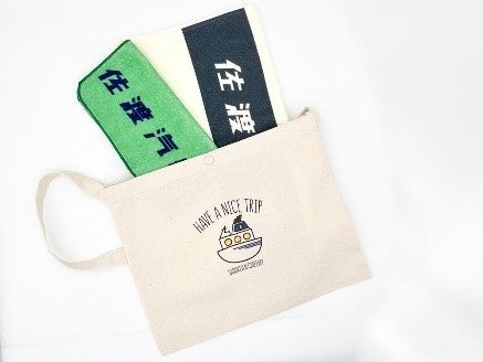 佐渡汽船のカーフェリー船内貸出用毛布をイメージしたタオル・ハンカチと船のイラスト付きサコッシュのセット。普段使いができるデザインで、使っていて船旅を思い出すこと間違いなし。