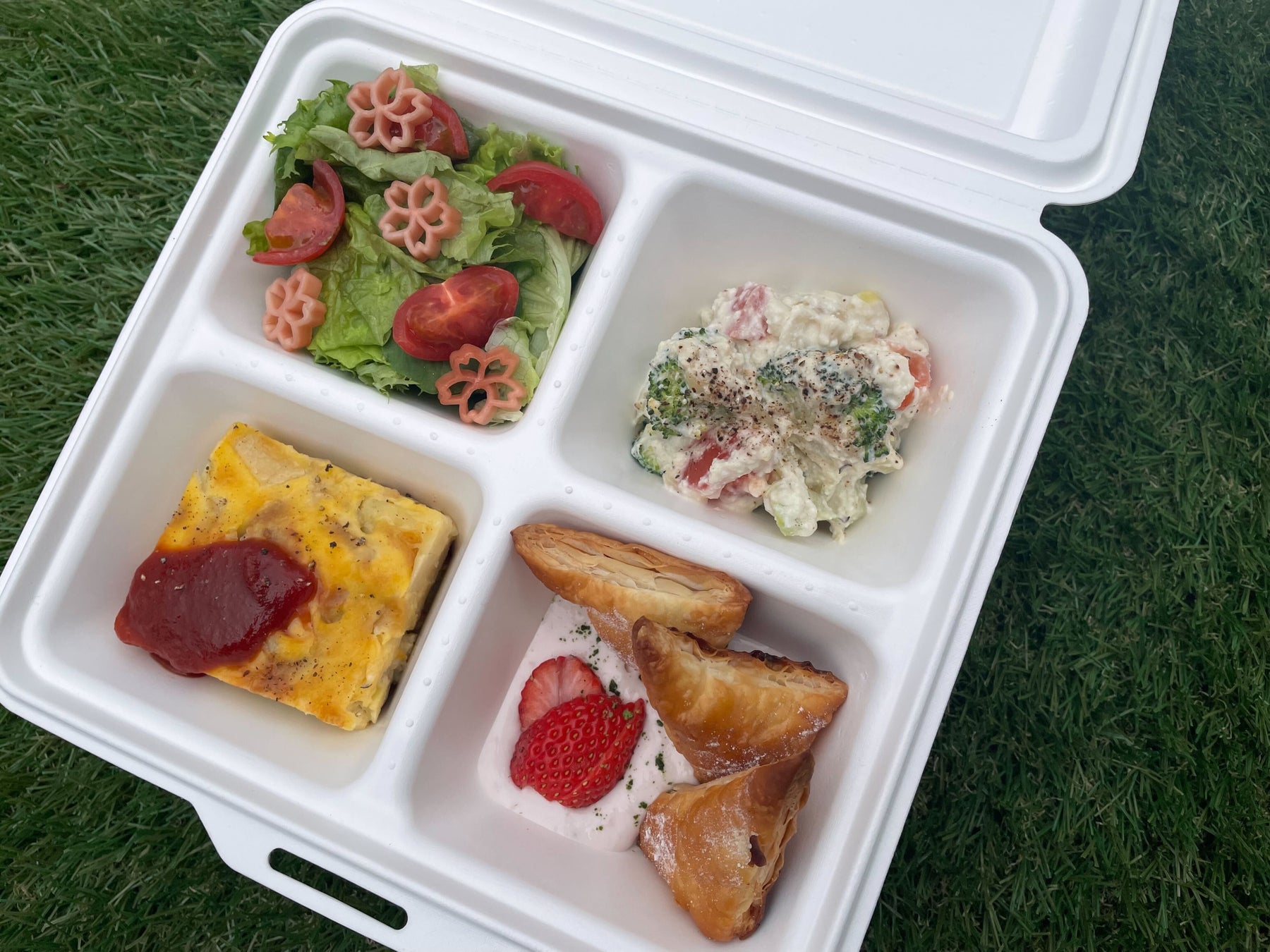 桜を見ながら、プラントベースオムレツやサラダなどのデリ4種類を、ショーケース内のお好きな花酵母パンと一緒に味わう