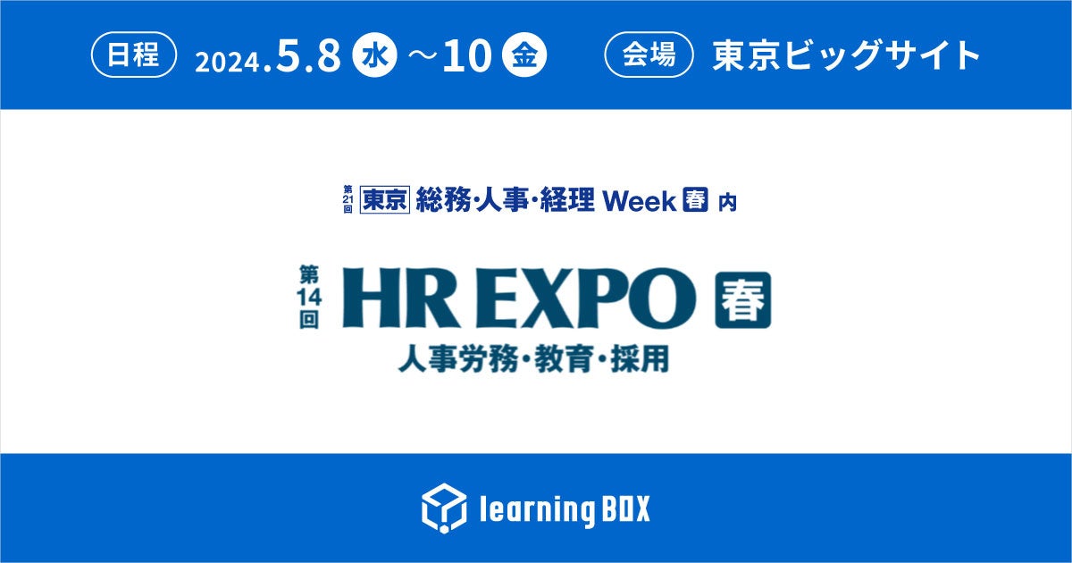 eラーニングシステムの開発・運営を行うlearningBOX(ラーニングボックス)株式会社(本社:兵庫県たつの市、代表取締役社長:西村 洋一郎)は、2024年5月8日(水)~10日(金)に東京ビッグサイトで開催される第21回総務・人事・経理 Weekの「第14回 HR EXPO(人事労務・教育・採用)[春]」に出展いたします。