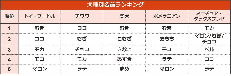犬種別のランキングでは、初めてポメラニアンの名前を調査しました。ほかの犬種ではランクインしたことのない「おもち」が2位に位置したことが特徴的です。丸い見た目や白い毛色を連想できることから人気となっているのかもしれません。トイ・プードルでは昨年初めてランクインした「むぎ」が早くも首位に躍り出ました。チワワと柴犬では大きな順位の変動は見られませんでした。ミニチュア・ダックスフンドでは3つの名前が同率2位となり、白熱した結果となりました。