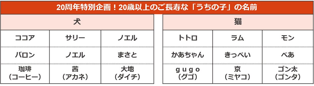 20周年特別企画として、20歳以上の「うちの子」のお名前を一部ご紹介します。