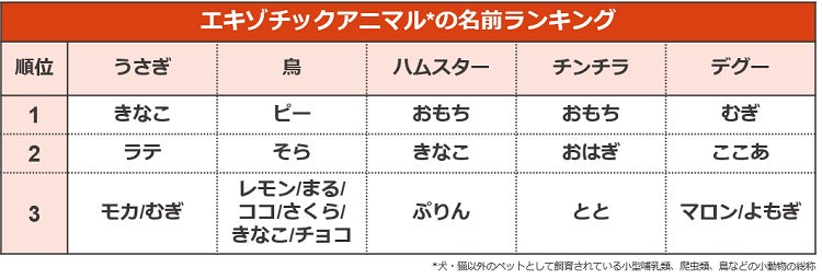 エキゾチックアニマルのランキングでは、初めてハムスター、チンチラ、デグーの名前を調査しました。ひらがなの名前が90%を占めており、食べ物や飲み物など身近にあってやわらかい響きの名前が人気のようです。うさぎは「ラテ」が初ランクインし、鳥は6種類もの名前が3位同率となり激戦を繰り広げています。