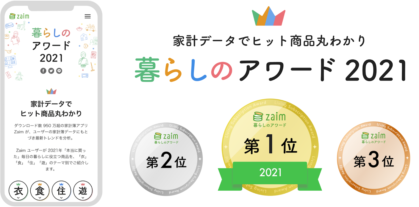くふうグループにおいて、950万ダウンロードを超える個人向け家計簿サービス「Zaim」を運営する株式会社 Zaim(本社:東京都港区・代表取締役:閑歳 孝子)は、2021年12月21日、家計簿に記録されたデータにもとづき属性別のユーザー購買商品を分析し、上位をランキングにした「暮らしのアワード 2021」(https://content.zaim.net/awards/2021)を公開しました。