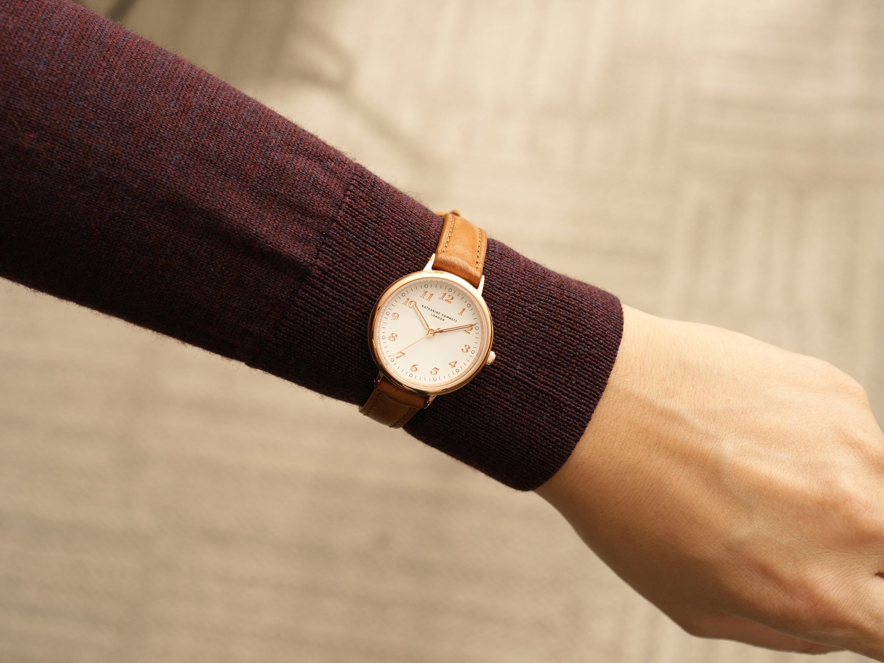 オーセンティックなブリティッシュスーツ、エレガントなドレスやオーガニック素材を用いたアイテムをメインに、“華やかさ”の中にこだわりのあるモノづくりを展開する思想は時計作りにも息づく。