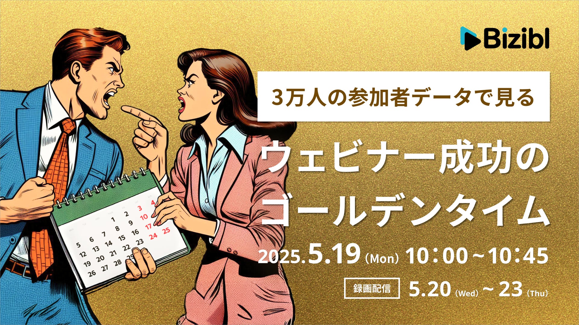 株式会社Bizibl Technologies(本社:東京都千代田区、代表取締役:花谷燿平、以下当社)は、延べ3万人分の参加ログを基に「曜日×時間帯×ターゲット」で最適開催タイミングを徹底検証した無料オンラインセミナー 『3万人の参加者データで見る!ウェビナー成功のゴールデンタイム』 を2025年5月19日(月)より開催いたします。