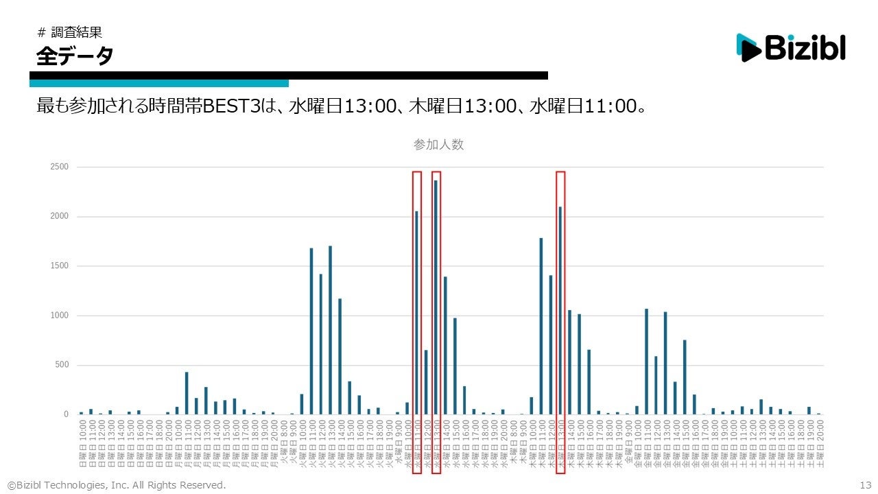 全業界平均で最も参加が集中したのは「水曜13:00」。次点は「木曜13:00」「水曜11:00」でした。