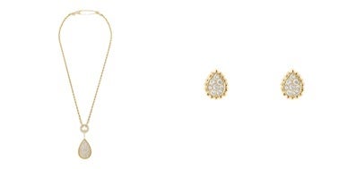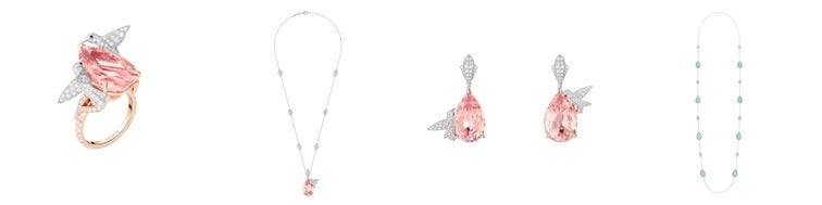 エゴ・ノワディムは、2018年発表のハイジュエリーコレクション「Nature Triomphante(ナチュール トリオンファント)」より朝露が植物をしたたる様子をダイヤモンドとホワイトゴールドで描写した「ロゼ」ネックレス、タッセルをダイヤモンドとホワイトゴールドで表現した「ポンポン」のイヤリング、「キャトル ラディアント」の様々なカットを施したダイヤモンドが全面にセットされたラージサイズのリングを纏って登場しました。