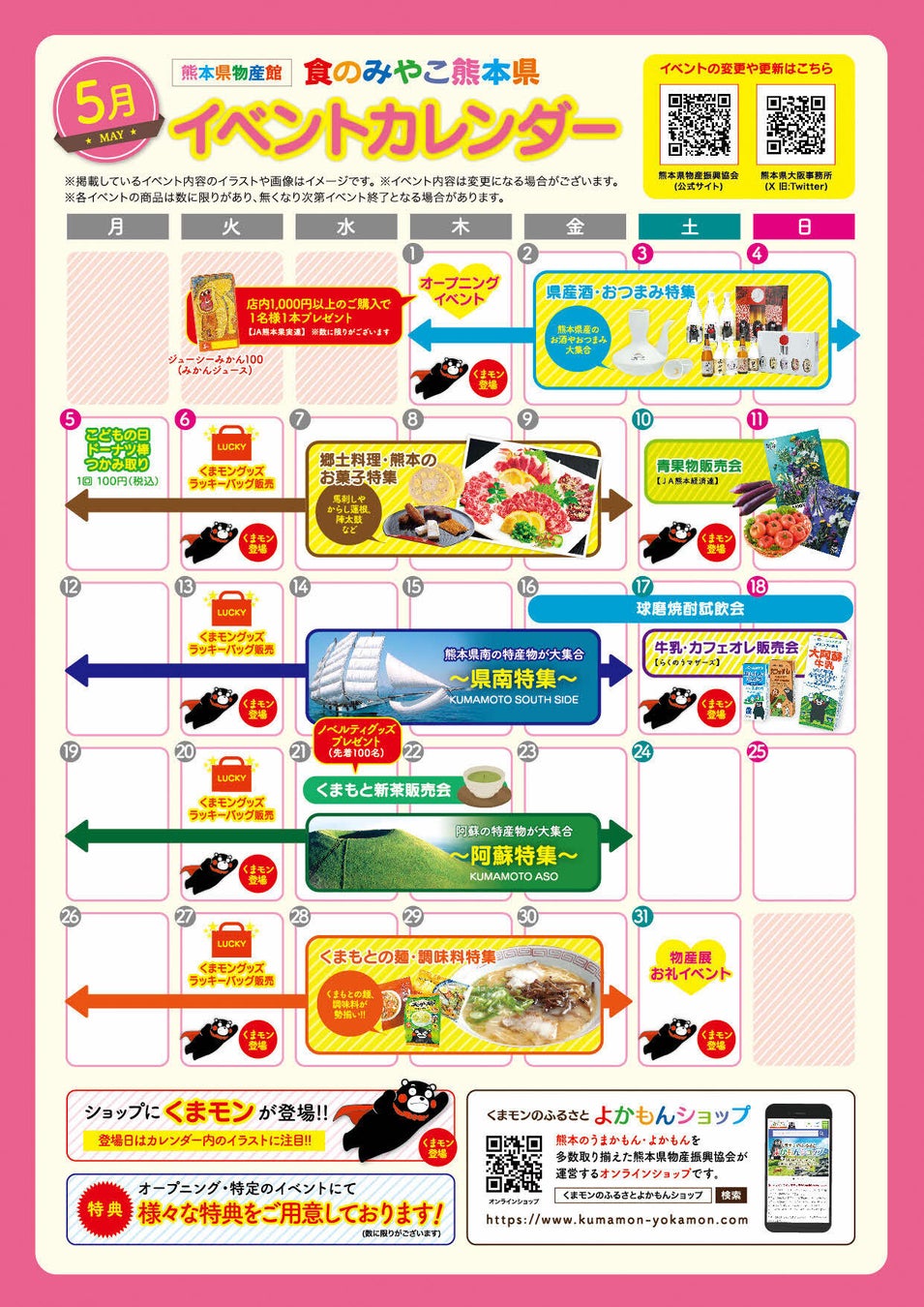 開催期間中には、熊本県が誇るグルメをはじめとした特産品をはじめ、くまモンが登場する日や“くまモングッズラッキーバッグ”の販売・“こどもの日”にはドーナツ棒のつかみ取りなど、様々なイベントを予定しています。