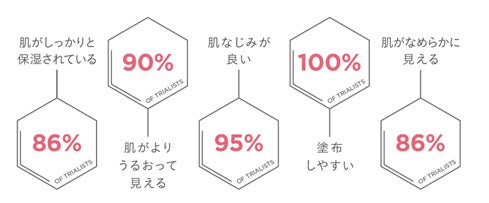 スーパーモイスチャライザーは、消費者評価調査において、「塗布しやすい」と回答した方が100%、「肌なじみが良い」は95%、「肌がよりうるおって見える」は90%、「肌がしっかりと保湿されている」と「肌がなめらかに見える」は86%のスコアを獲得しました。