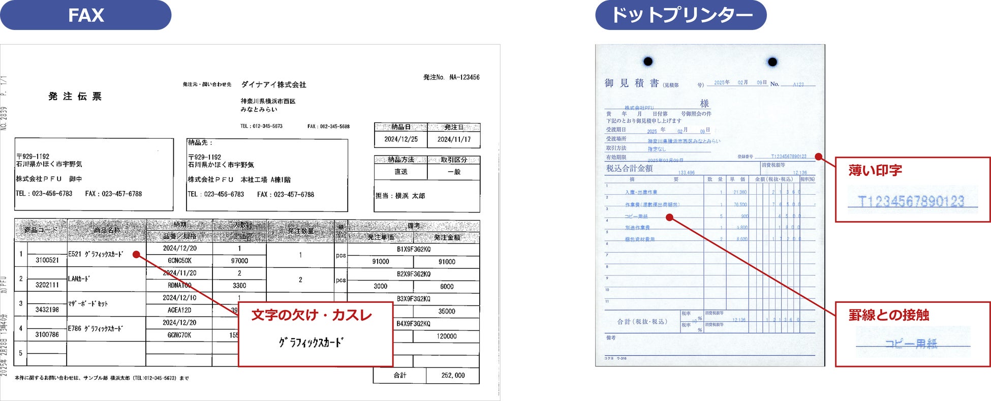 AI-OCRを強化し、カスレや薄い印字など、低品質な活字も高精度に認識可能になりました。これにより、ドットプリンターで印字された伝票やFAX注文書など、従来読み取りが難しかった罫線との接触や特殊フォントを含む帳票も正確にデータ化できます。