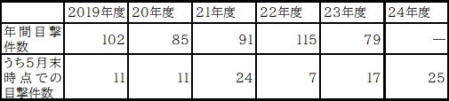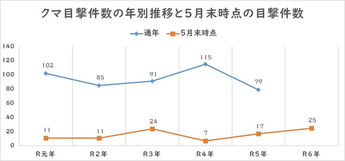 2024年度の5月末時点でのクマの目撃件数は25件であり、これは過去6年間で最多となっていますが、現在は1つ目の目撃のピークであると考えられるため、年間を通じた目撃数が今後どのように推移していくかは予測できません。