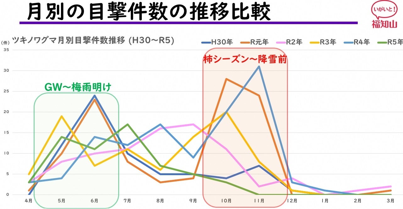 過去6年間の目撃件数を月ごとのグラフにすると、5月~6月(GW~梅雨明け)と9月下旬~11月上旬(柿の実が熟す時期)の年間2回、目撃件数のピークが発生する傾向が読み取れます。