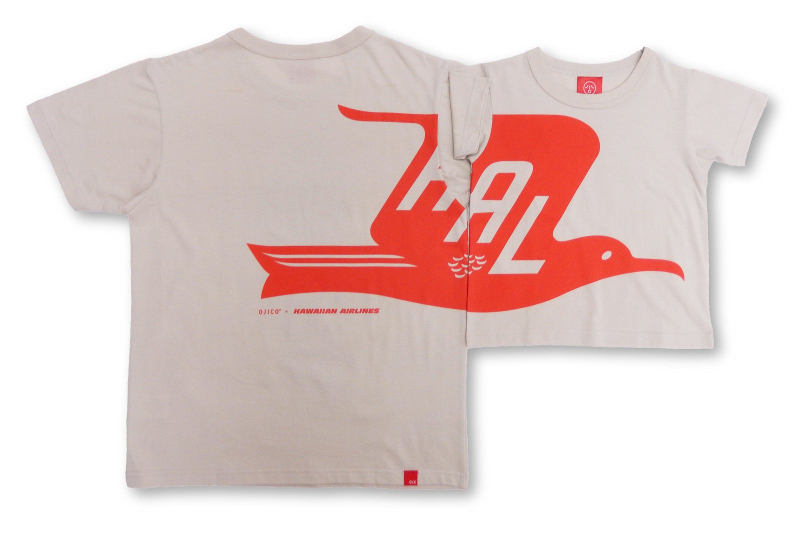 ハワイに生息する真っ赤な野鳥「イイヴィ」がモチーフとなった50年代のロゴマーク。ハワイアン航空のアイコニックなロゴの一つをTシャツのフロントからバックにかけて大胆に配置しました。
