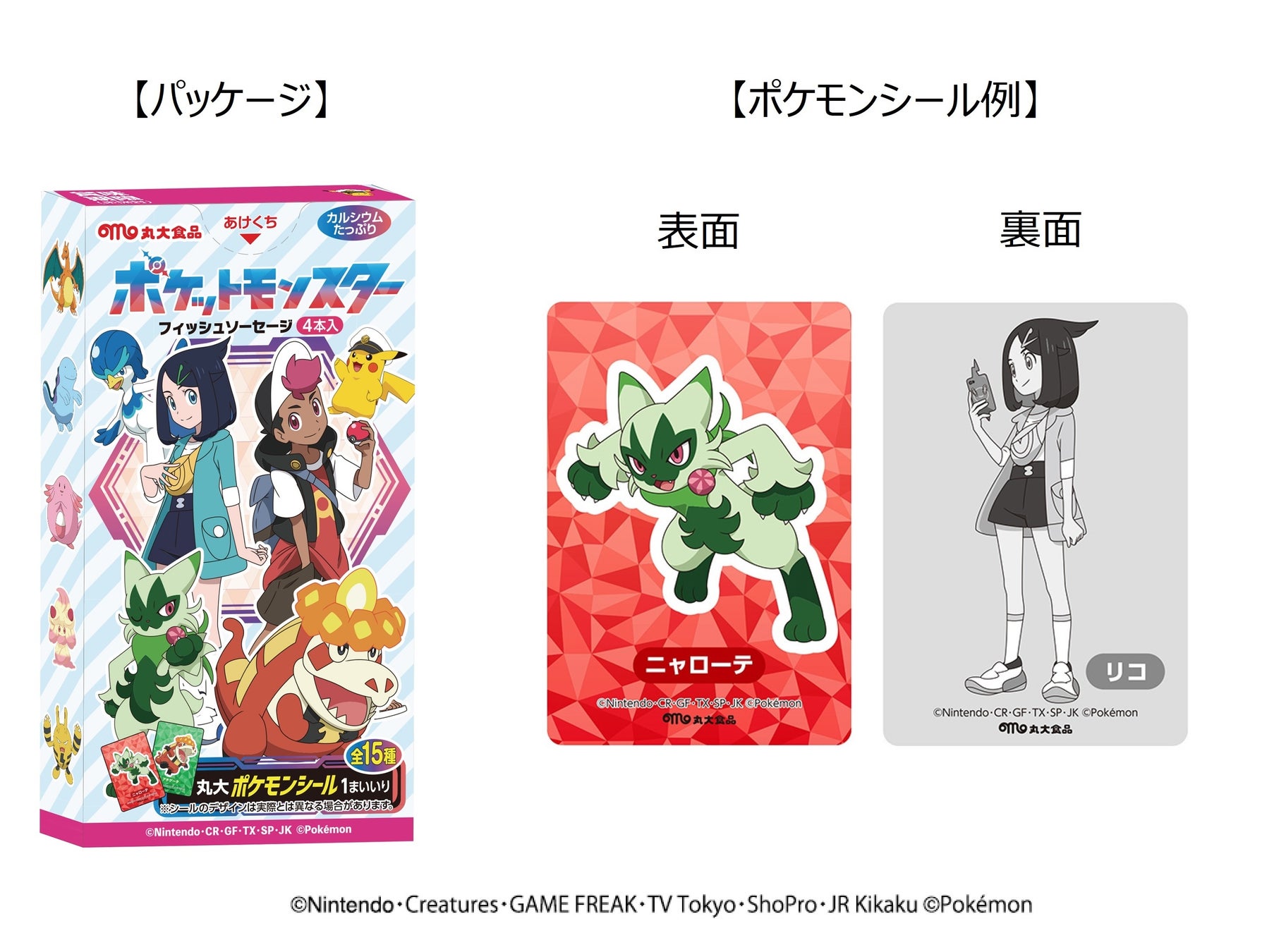 2023年4月からスタートしたTVアニメ「ポケットモンスター」をパッケージデザインに起用した、カルシウムたっぷりのフィッシュソーセージです。「ポケモンシール」1枚入りで、シールは全部で15種類。シール台紙の裏には登場人物やいにしえのモンスターボールなどのデザインをプリントしました。