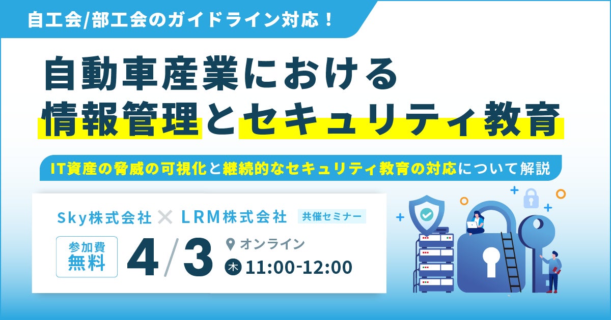 LRM株式会社(本社:兵庫県神戸市、代表取締役CEO:幸松哲也)と、Sky株式会社(本社:東京都港区・大阪府大阪市、代表取締役:大浦淳司)は、2025年4月3日(木) 11時から、自動車産業における情報管理とセキュリティ教育に関するセミナーを無料開催します。Zoomでお気軽にご視聴いただけますので、ぜひご参加ください。