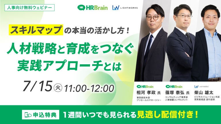本講演では、スキルマップを活用した戦略的なタレントマネジメントとキャリア開発の実践的アプローチについて、HRBrainとLightworksが共催でお届けします。