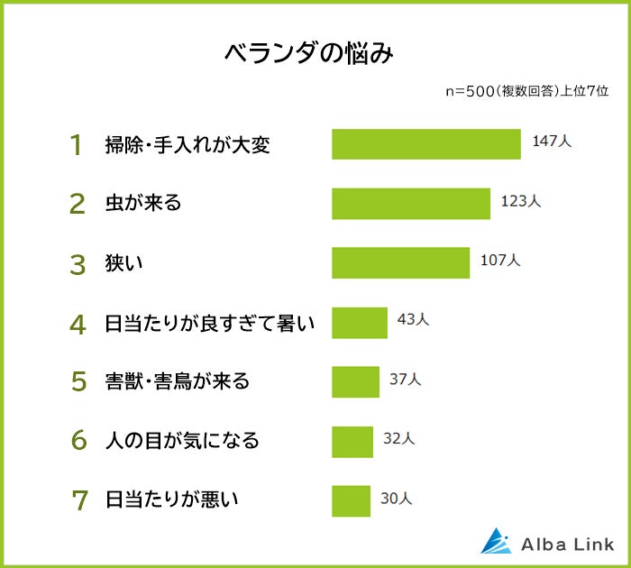 株式会社AlbaLink(本社:東京都江東区、代表取締役:河田 憲二)は、全国の男女500人を対象に「ベランダの悩みに関する意識調査」を実施し、そのデータをランキングにしました。
