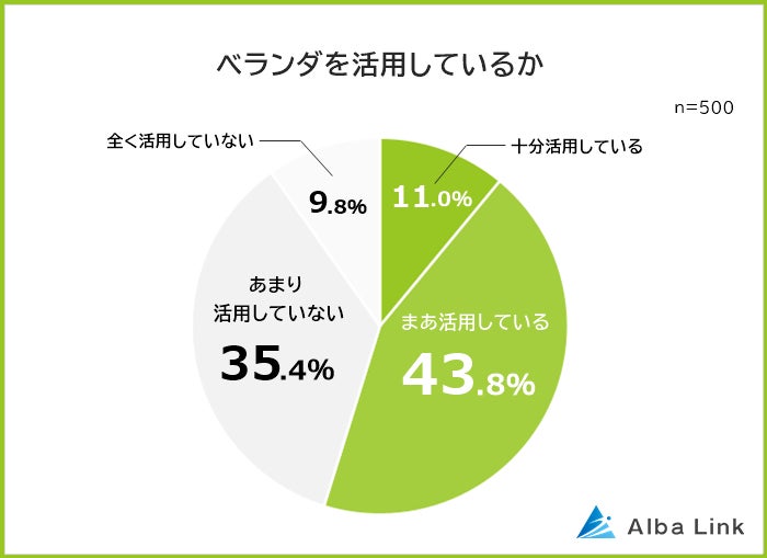 ベランダを十分に活用していると答えたのは11.0%。「まあ活用している(43.8%)」と合わせても半数を少し超えただけの結果に。ベランダを活用している人は、意外に少ない印象です。