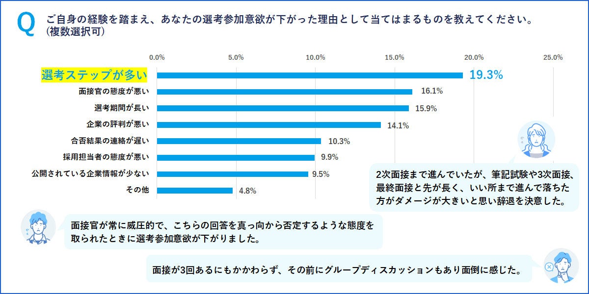 選考の参加意欲が下がった理由を聞いたところ、「選考ステップが多い」が19.3%で最も多い回答。フリーアンサーで、選考終盤で不合格となった場合の影響や、他社と並行して受けている選考への弊害が挙げられていました。