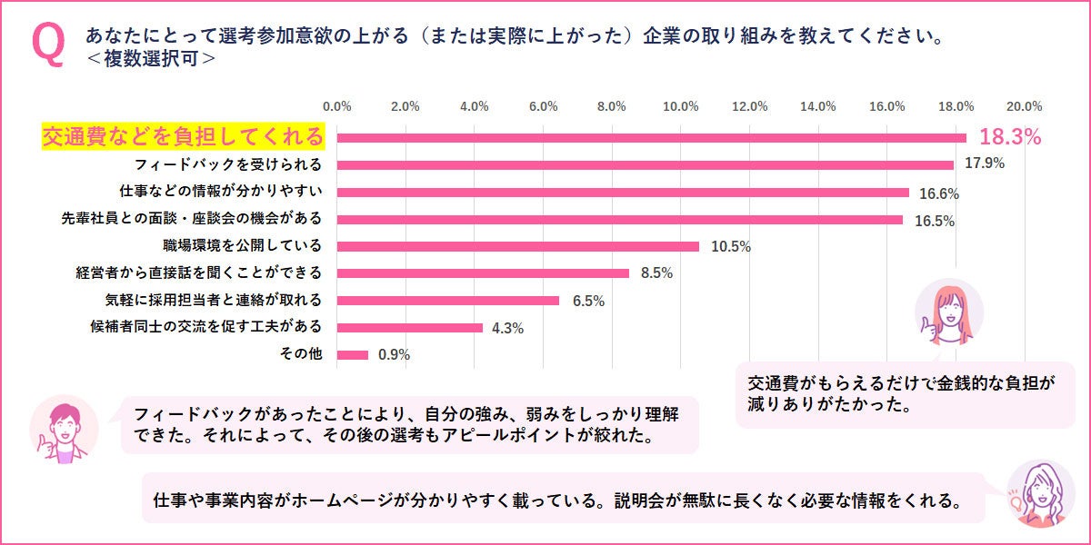 選考の参加意欲が上がる(上がった)取り組みを聞いたところ、「交通費などを負担してくれる」が18.3%と最も高い回答。その理由として、就職活動中はアルバイトを制限しているためといった意見が挙がっていました。次いで、「フィードバックを受けられる」が17.9%、「仕事などの情報が分かりやすい」16.6%や「先輩社員との座談会」16.5%などが上位にありました。