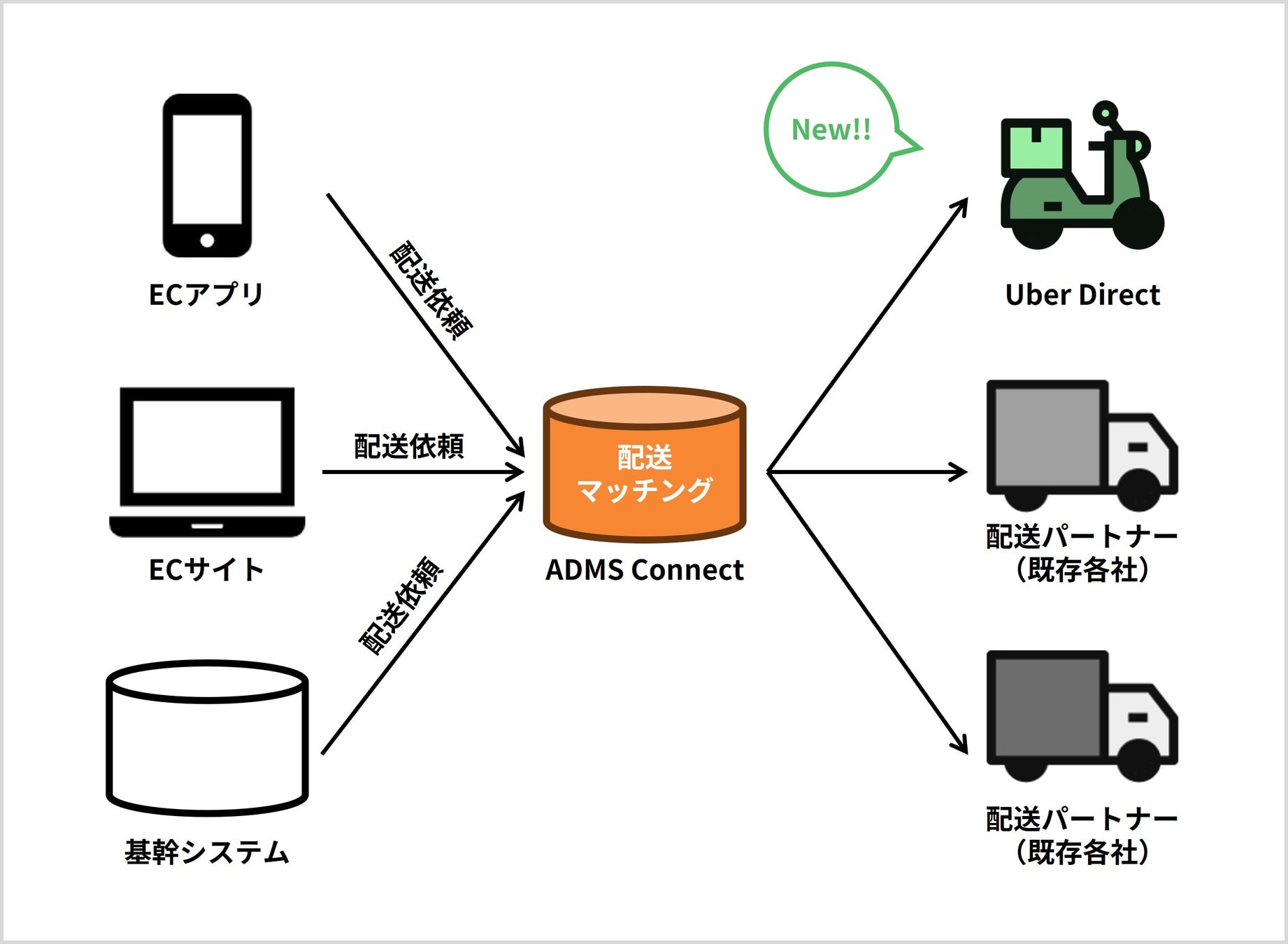 荷主様のECサービスや基幹システムと当社提供のADMS Connect(アダムス コネクト)を連携させることで、自動で配送マッチング(※1)が行われ、当社の配送ネットワーク(共同配送網)を利用することが可能です。