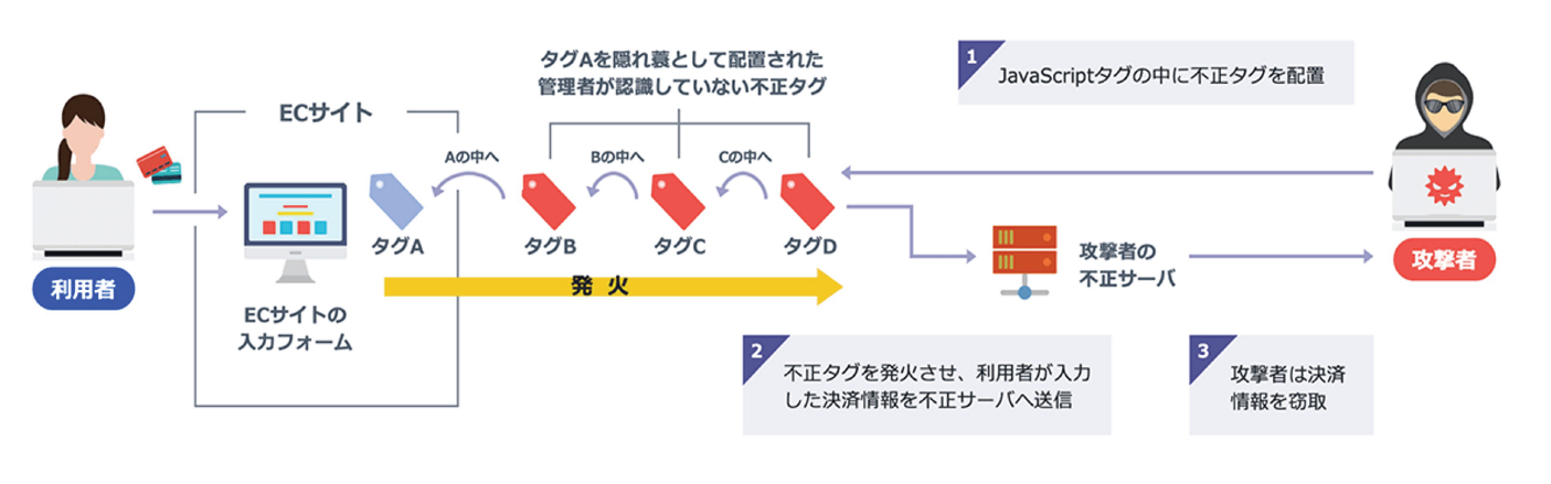 3rdPartyのJavaScriptタグを利用して、管理者が知らない不正な4thPartyタグを密かに配置し、データを盗み出す「ブギーバッキング」と呼ばれる高度なハッキング技術が出現しています。