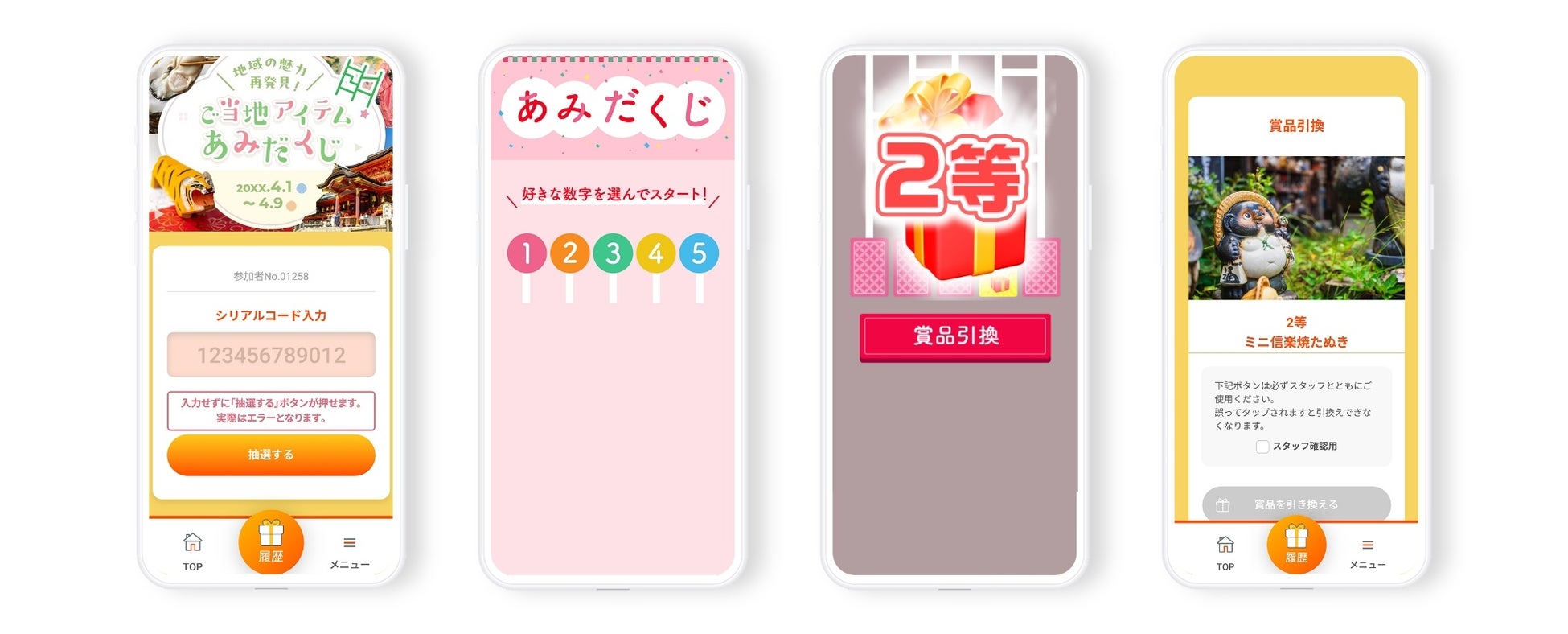 あみだくじ型抽選ゲームでは、参加者が自ら選択肢を選択して抽選を開始できます。抽選結果に応じて等級別特産品が当たります。参加者は、抽選結果の表示を心待ちにしながら、ご当地アイテムが手に入る楽しみを感じることができます。