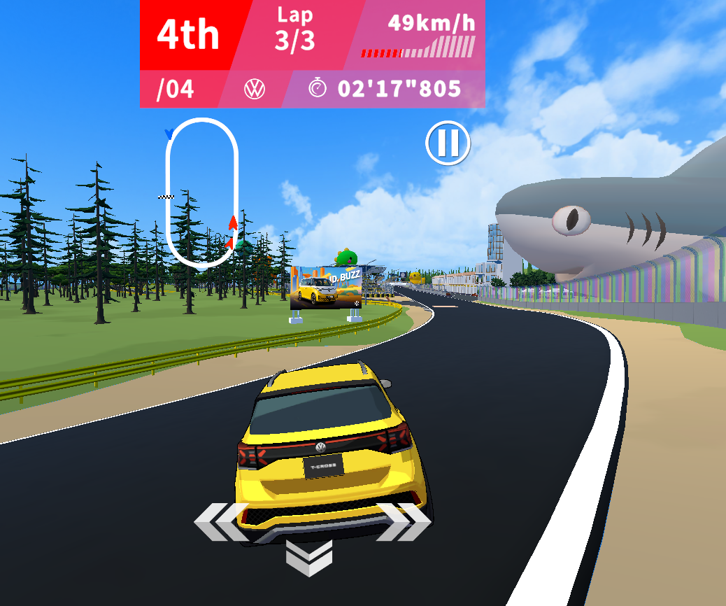 本ゲームは、フォルクスワーゲンの多彩な車種ラインアップで楽しめるレーシングゲームです。「Polo」「T-Cross」「ID. Buzz」などの車種を選択し、コースを選択してレースを行い、タイムを競います。