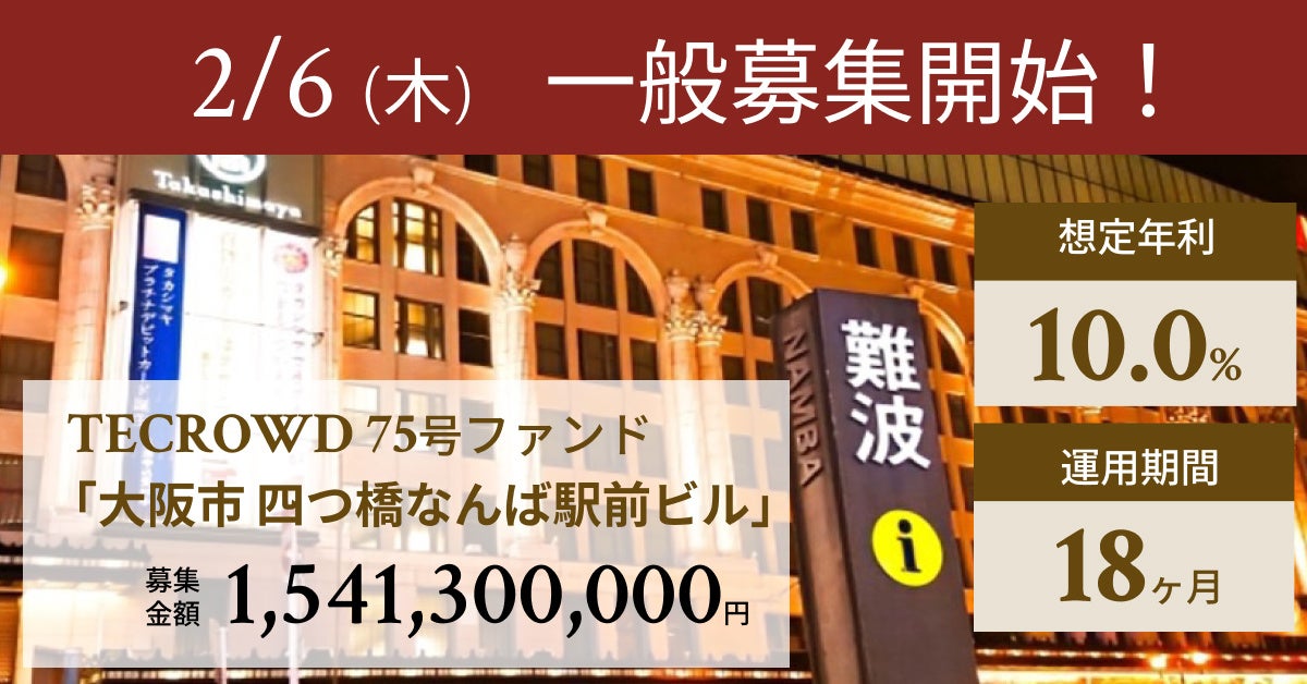 2025年2月6日(木)18時より75号ファンド「大阪市 四つ橋なんば駅前ビル」の募集を開始いたします。